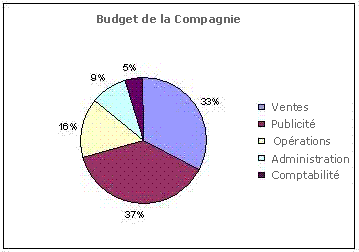 Ce type de graphique est le plus souvent utilisé pour représenter visuellement un ensemble, divisé d'après ses composantes. L’exemple ci-dessous montre le budget d'une société comme un cercle. C'est donc dire que pour déterminer le nombre de degrés de chacune des composantes, il faut multiplier le pourcentage de la composante par 360 degrés. Par exemple, la composante Ventes étant de 33 % :