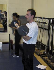 - Starting with the right hand, curl the dumbbell straight up toward the shoulder until the arm cannot go any further
